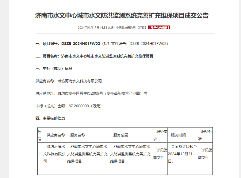 濟(jì)南市水文中心城市水文防洪監(jiān)測系統(tǒng)完善擴(kuò)充維保項(xiàng)目,項(xiàng)目金額67.2萬元,主要服務(wù)內(nèi)容為濟(jì)南市城市水文防洪監(jiān)測系統(tǒng)完善擴(kuò)充項(xiàng)目已建站點(diǎn)的日常運(yùn)行維護(hù)、保養(yǎng)、檢修,保障自動測報(bào)設(shè)備正常運(yùn)行,使信息化平臺更好服務(wù)于防汛監(jiān)測和指揮調(diào)度。