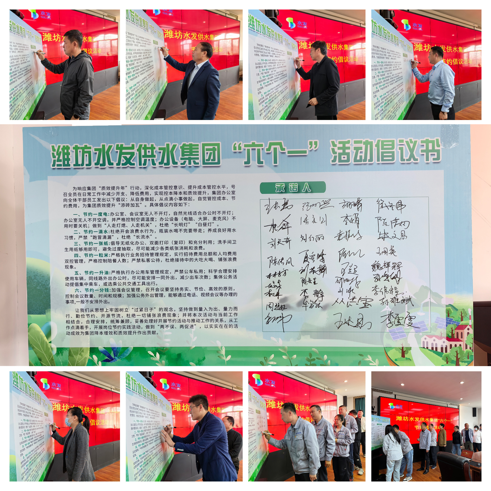 會上,供水集團(tuán)黨總支書記、董事長張勇首先宣讀了“六個(gè)一”活動倡議書,號召全體員工提升降本增效意識,爭做勤儉辦公、節(jié)能降耗的先進(jìn)模范。隨后,供水集團(tuán)領(lǐng)導(dǎo)班子成員及參加活動的干部職工紛紛在活動展板上簽上自己的名字,承諾自覺踐行“六個(gè)一”節(jié)約倡議。